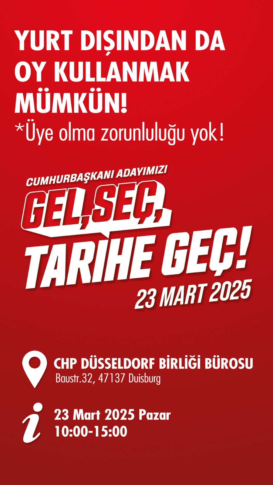 CHP Almanya Federasyonu, 23 Mart Pazar günü yapılacak olan Cumhurbaşkanı Adayı'nın belirleneceği önseçim için çağrıda bulundu.