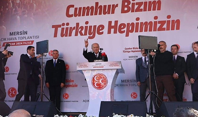 Bahçeli'nin konuşmasından satırbaşları;Mersin her şeyden evvel tarih, kültür, tarım ve ticaret kentidir. Ayrıca Mersin kardeşliğin timsalidir."İttifak ortaklarına bedel ödeyen, sürekli şaibelerle anılan bir belediye karşımızdadır. CHP zihniyeti sınıfta kalmış, hepten çuvallamıştır. Yapamayan gitmeli, yapacak olan gelmelidir."İnanıyorum ki Mersin, kamburlarından kurtulacak. Ayakbağlarını söküp atacak. Yalan belediyeciliğin 63 günlük ömrü kaldı. Yozlaşmış belediyeciliğin sonu göründü."MERSİN'DE HİZMETE TALİBİZ"Mersin, gücüne güç katacak, yükseldikçe yükselecek. Herkesin elinden tutacağız. Bağın, bahçenin, bostanın bereketi olacağız. Mersin'den Antalya'ya kadar otoyollarının tünellerini tamamlayıp Toroslar'ın iki yakasını kenetleyeceğiz."Önümüzdeki beş yıl için sizlerden olur ve onay istiyoruz. Mersin'i daha da büyütmek, geliştirmek arzusundayız. Cumhur İttifakı'nın birbirinden değerli belediye başkan adaylarına, Mersin'in hizmetine talibiz. Mersin Büyükşehir Belediye Başkan Adayımız Sayın Serdar Soydan'dır." "CHP ÇUVALLAMIŞTIR"Şimdiye kadar kazanan bir avuç çıkarcıdır. CHP'li büyükşehir belediyesi bağlanan umutları israf etmiştir, hayal kırıklığı devasa boyutlara ulaşmıştır. Devamlı şaibelerle anılan bir belediye yönetimi karşımızdadır. CHP zihniyeti hepten çuvallamıştır. Başaracak olan Mersin sevdalıları şehremini vazifesini üstlenmeli. Kayırmacılık, yolsuzluk Mersin'in önünü kapattı. Üretmeyenlere, Mersin'i tanımayanlara uğurlar olsun demeliyiz. Mersin için ümitler yeşermiştir. Mersin bizim, Türkiye hepimizindir.Demlenen dejenere olmuş cepheye karşılık veriyorsunuz. Mersin ayak bağlarını söküp atacak. Yıkım belediyeciliğinin 63 günü kaldı. İttifak ortaklarına bedel ödeyen, sürekli şaibelerle anılan bir belediye karşımızdadır. CHP zihniyeti sınıfta kalmış, hepten çuvallamıştır. Yapamayan gitmeli, yapacak olan gelmelidir.İnanıyorum ki Mersin, kamburlarından kurtulacak. Ayakbağlarını söküp atacak. Yalan belediyeciliğin 63 günlük ömrü kaldı. Yozlaşmış belediyeciliğin sonu göründü. Mersin, gücüne güç katacak, yükseldikçe yükselecek. Herkesin elinden tutacağız. Bağın, bahçenin, bostanın bereketi olacağız. Mersin'den Antalya'ya kadar otoyollarının tünellerini tamamlayıp Toroslar'ın iki yakasını kenetleyeceğiz.Önümüzdeki beş yıl için sizlerden olur ve onay istiyoruz. Mersin'i daha da büyütmek, geliştirmek arzusundayız. Cumhur İttifakı'nın birbirinden değerli belediye başkan adaylarına, Mersin'in hizmetine talibiz. Mersin Büyükşehir Belediye Başkan Adayımız Sayın Serdar Soydan'dır.İŞGALCİ İSRAİL'İN GAZZE'DEKİ KATLİAMLARIGazze'de kahredici bir katliam yaşanıyor. Çocuklar katlediliyor. İsrail, soykırım suçu işliyor. Masum, savunmasız insanları hedef alıyor. Artık bu kan durmalı, silahlar susmalıdır.Uluslararası Adalet Divanı'nda İsrail'in barbar saldırılarıyla ilgili ihtiyati tedbir kararı alınması müspet bir gelişmedir. İnsani taleplere tercüman olan bu ara kararı hiçbir ülke görmezden gelemez, üç maymunu oynayamaz.Soykırım davasının esastan görüşülecek olması mühim bir adalet kazanımıdır."ABD, SURİYE VE IRAK'TAN ÇEKİLMELİ"PKK/YPG'yi silahlandırıp Türkiye'ye yönelik kanlı eylem talimatı veriyorlar. Hürmet, rahmet ve minnetle yad ettiğimiz kahraman evlatlarımızı şehit ediyorlar. Milli birlik ve kardeşlik hukukumuzu dinamitlemek için yanıp tutuşuyorlar. FETÖ'cü alçakları sürekli tedavülde tutuyorlar. ABD, Irak ve Suriye'deki varlığımızdan son derece huzursuzdur. Peki Amerika Birleşik Devletleri, Suriye'de ne arıyor, Irak'ta ne geziyor? İç sorunları giderek yaygınlaşan ABD'nin komşu ülkelerdeki varlığı gayriahlakidir, gayrihukukidir, gayrimeşrudur. ABD'nin Suriye ve Irak'tan tamamıyla çekilmesinden başka makul, mantıklı ve adil bir seçenek kesinlikle yoktur. Türkiye, ABD ile sınır komşusu olmaktan rahatsızdır. İsveç'in NATO'ya katılım protokülünün onaylanmasının ardından ABD'nin sözünde durarak F-16'larla ilgili beklentimizi derhal karşılaması müttefiklik namusudur. Türkiye, egemenlik haklarından vazgeçmeyecek, bölünmez bütünlüğünden ödün vermeyecektir.
