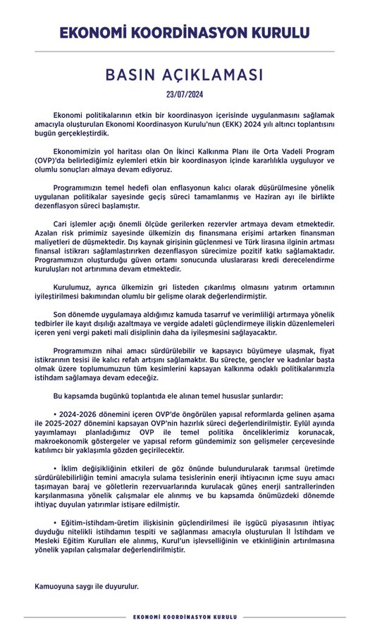 Açıklamada, 2024 yılının 6'ncı Ekonomi Koordinasyon Kurulu toplantısının gerçekleştirildiği belirtilerek, "Ekonomimizin yol haritası olan 12'nci Kalkınma Planı ile OVP'de belirlediğimiz eylemleri etkin bir koordinasyon içinde kararlılıkla uyguluyor ve olumlu sonuçları almaya devam ediyoruz. Programımızın temel hedefi olan enflasyonun kalıcı olarak düşürülmesine yönelik uygulanan politikalar sayesinde geçiş süreci tamamlanmış ve haziran ayı ile birlikte dezenflasyon süreci başlamıştır. Cari işlemler açığı, önemli ölçüde gerilerken rezervler artmaya devam etmektedir. Azalan risk primimiz sayesinde ülkemizin dış finansmana erişimi artarken, finansman maliyetleri de düşmektedir. Dış kaynak girişinin güçlenmesi ve Türk lirasına ilginin artması finansal istikrarı sağlamlaştırırken, dezenflasyon sürecimize pozitif katkı sağlamaktadır. Programımızın oluşturduğu güven ortamı sonucunda uluslararası kredi derecelendirme kuruluşları not artırımına devam etmektedir. Kurulumuz, ayrıca ülkemizin gri listeden çıkarılmış olmasını yatırım ortamının iyileştirilmesi bakımından olumlu bir gelişme olarak değerlendirmiştir" denildi.