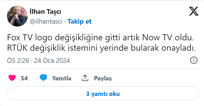 FOX TV logo değişikliğine gitti. Kanalın ismi de değişerek Now TV oldu. RTÜK değişiklik istemini yerinde bularak onayladı.Kanalın isim değişikliğinin sebebi Disney grubunun FOX’u satın alırken isim hakkını belli bir süreliğine alması… Bu süre dolduğu için de dünyanın birçok ülkesinde olduğu gibi Türkiye'de de ilgiyle izlenen kanalın adı değişti.