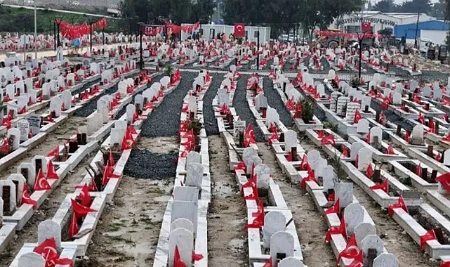 Türkiye’de 11 ilde yıkıma yol açan 6 Şubat depremlerinin üzerinden 1 yıl geçti. Depremde ölenlerin defnedildiği Reyhanlı yolu üzerindeki Deprem Mezarlığı, Türk Bayrakları ile donatıldı.