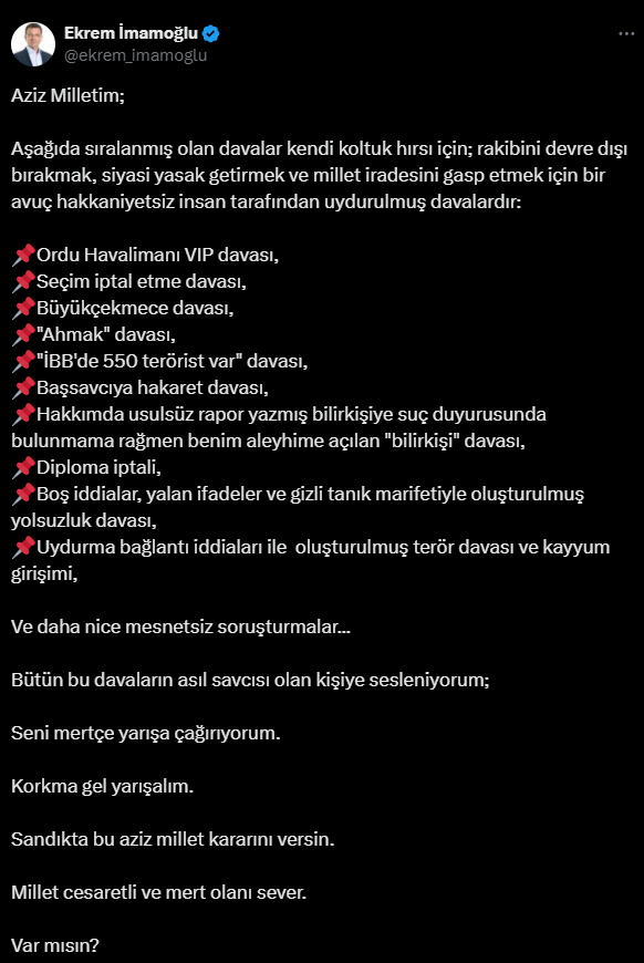 Silivri'deki Marmara Cezaevinde tutuklu bulunan Ekrem İmamoğlu'nun sosyal medya hesabından yapılan paylaşımda, "Kayyum girişimi ve daha nice mesnetsiz soruşturmalar... Bütün bu davaların asıl savcısı olan kişiye sesleniyorum; seni mertçe yarışa çağırıyorum. Korkma gel yarışalım. Sandıkta bu aziz millet kararını versin" ifadeleri kullanıldı.Silivri'deki Marmara Cezaevinde tutuklu bulunan Ekrem İmamoğlu'nun mesajı, sosyal medya hesabından yayımlandı.Mesajda, İmamoğlu hakkında açılan davaları sıralayarak, Cumhurbaşkanı Recep Tayyip Erdoğan'ı seçime davet etti. İmamoğlu'nun mesajı şöyle:"Aziz milletim; aşağıda sıralanmış olan davalar kendi koltuk hırsı için; rakibini devre dışı bırakmak, siyasi yasak getirmek ve millet iradesini gasp etmek için bir avuç hakkaniyetsiz insan tarafından uydurulmuş davalardır:Ordu Havalimanı VIP davası, seçim iptal etme davası, Büyükçekmece davası, 'Ahmak' davası, 'İBB'de 550 terörist var' davası, başsavcıya hakaret davası, hakkımda usulsüz rapor yazmış bilirkişiye suç duyurusunda bulunmama rağmen benim aleyhime açılan 'bilirkişi' davası, diploma iptali, boş iddialar, yalan ifadeler ve gizli tanık marifetiyle oluşturulmuş yolsuzluk davası, uydurma bağlantı iddiaları ile oluşturulmuş terör davası ve kayyum girişimi ve daha nice mesnetsiz soruşturmalar...Bütün bu davaların asıl savcısı olan kişiye sesleniyorum; seni mertçe yarışa çağırıyorum. Korkma gel yarışalım. Sandıkta bu aziz millet kararını versin. Millet cesaretli ve mert olanı sever. Var mısın?"