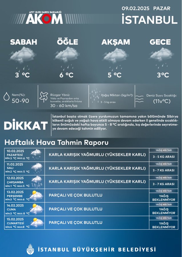 İstanbul Büyükşehir Belediyesi Afet İşleri Dairesi Başkanlığı (AKOM), karla karışık yağmurun 12 Şubat Çarşamba gününe kadar devam edeceğini duyurdu. AKOM'dan paylaşılan verilere göre, önümüzdeki üç günde de yağış bekleniyor. Sibirya kökenli soğuk ve yağışlı havanın etkili olacağı belirtilen açıklamada, il genelinde sıcaklıkların önümüzdeki hafta boyunca 5 ila 8 derece aralığında, kış değerlerinde seyredileceği aktarıldı.