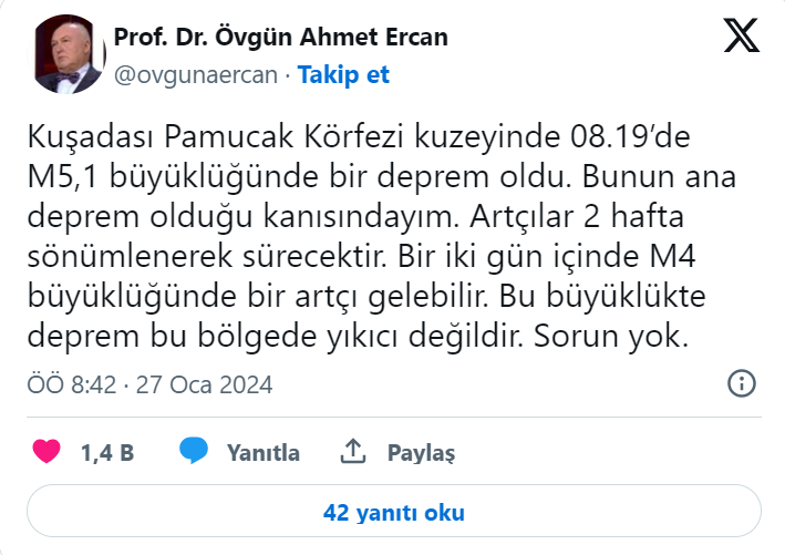 Afet ve Acil Durum Yönetimi Başkanlığı (AFAD) verilerine göre, Ege Denizi'nde Menderes ilçesi açıklarında saat 08.19 sıralarında 5.1 büyüklüğünde deprem meydana geldi.Menderes'e 5.42 kilometre mesafede gerçekleşen depremin derinliği 8.51 kilometre olarak ölçüldü. Menderes ve çevre ilçelerden de hissedilen depremde, ilk belirlemelere göre herhangi bir hasarın meydana gelmediği öğrenildi.Prof. Dr. Övgün Ahmet Ercan ise sosyal medya hesabından depremi değerlendirdi.Ercan'ın ifadeleri şöyle: "Kuşadası Pamucak Körfezi kuzeyinde 08.19’de M5,1 büyüklüğünde bir deprem oldu. Bunun ana deprem olduğu kanısındayım. Artçılar 2 hafta sönümlenerek sürecektir. Bir iki gün içinde M4 büyüklüğünde bir artçı gelebilir. Bu büyüklükte deprem bu bölgede yıkıcı değildir. Sorun yok."