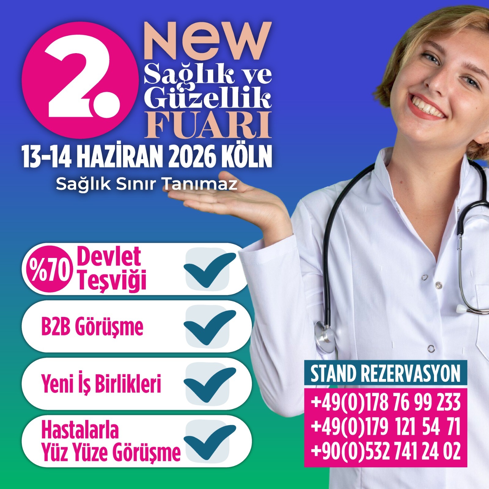 Almanya’nın Köln kentinde sağlık ve güzellik sektörü ikinci kez bir araya geliyor. Platin Werbeagentur – Marketing tarafından düzenlenen 2. NEW HEALTH & BEAUTY EXPO, Türkiye ve Almanya’da sağlık sektöründe hizmet veren firma ve kurumları buluşturacak. “Sağlık sınır tanımaz” mottosuyla gerçekleştirilecek fuar, 13-14 Haziran 2026 tarihlerinde, Köln’ün en prestijli otellerinden biri olan Pullman Hotel’de iki gün boyunca ziyaretçilerini ağırlayacak. Fuara giriş ziyaretçiler için ücretsiz olacak.
