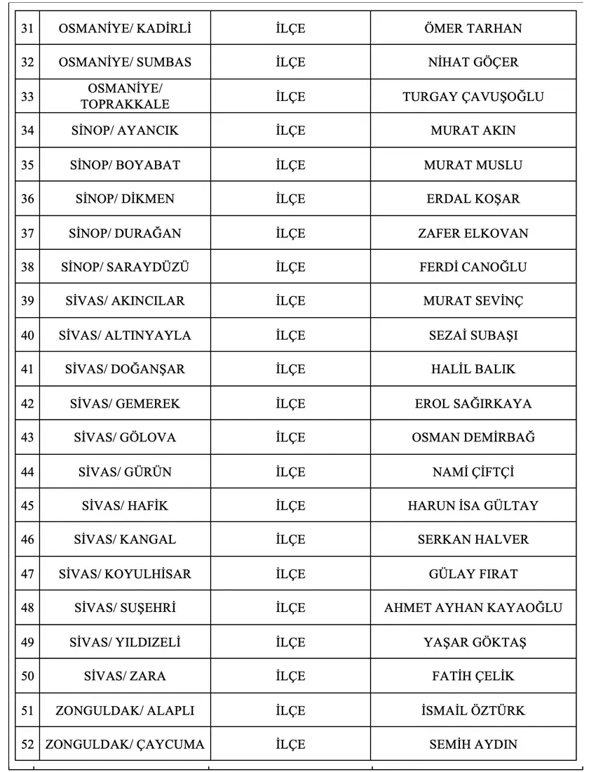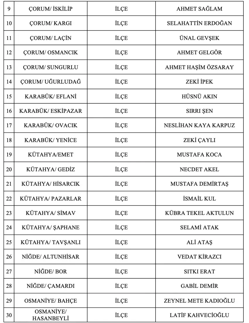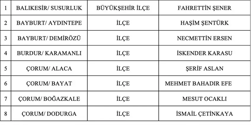 MHP, 31 Mart 2024 Mahalli İdareler Seçimlerinde 5. etap olarak adaylıkları kesinleşen 1 Büyükşehir İlçe, 54 İlçe Belediye Başkan Adayı olmak üzere toplam 55 adayın daha isimlerini açıkladı.Milliyetçi Hareket Partisi Genel Başkan Yardımcısı Sadir Durmaz; "Partimizin yetkili kurullarının yapmış olduğu değerlendirme ve Genel Başkanımız Sayın Devlet Bahçeli'nin onayları sonucunda 31 Mart 2024 Mahalli İdareler Seçimlerinde 5. etap olarak adaylıkları kesinleşen 1 Büyükşehir İlçe, 54 İlçe Belediye Başkan Adayımız olmak üzere toplam 55 adayımızın isim listesi aşağıdadır" dedi.