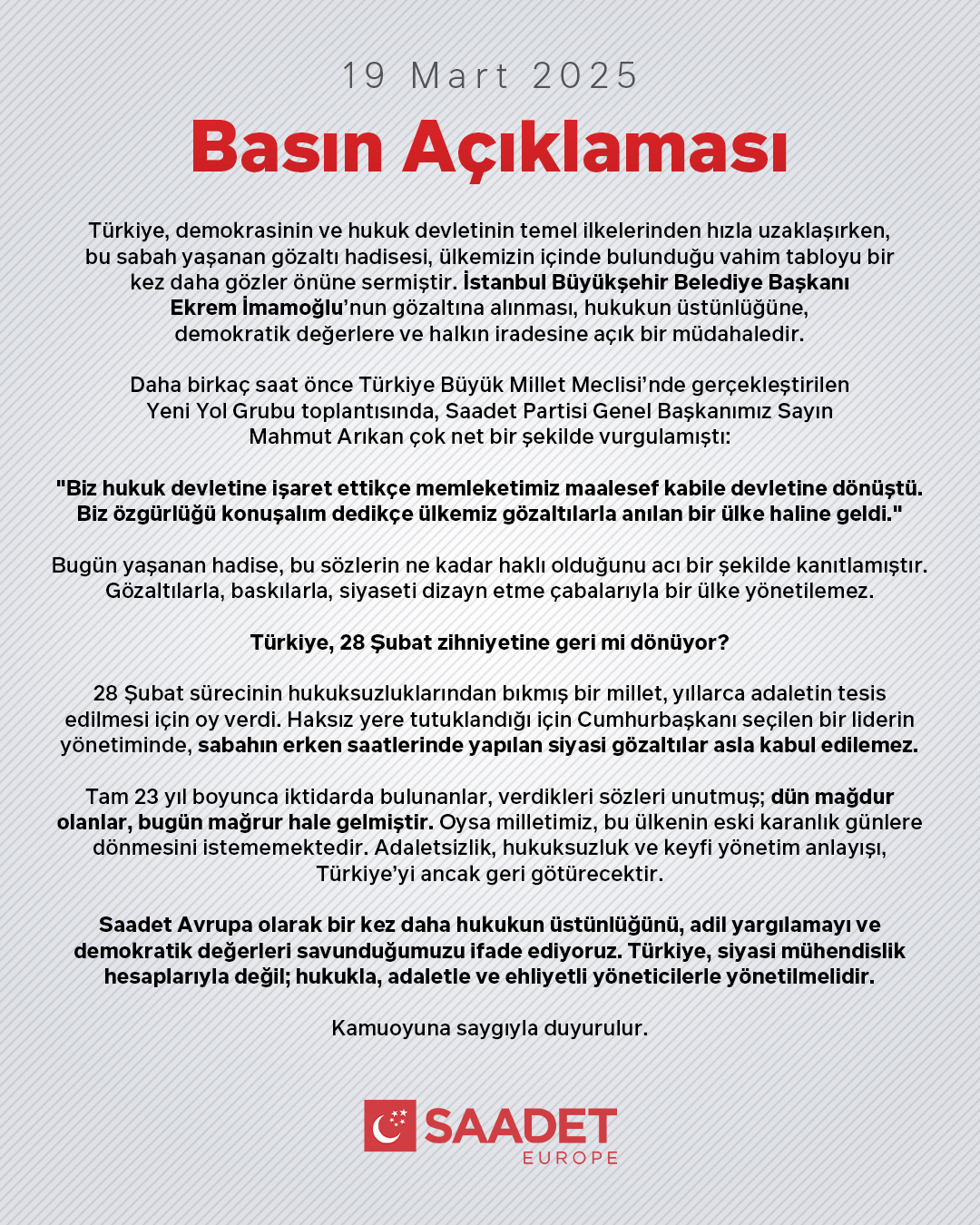 Saadet Partisi Avrupa, İBB Başkanı Ekrem İmamoğlu'nun gözaltına alınmasıyla ilgili destek açıklaması yaptı.Saadet Partisi Avrupa'nın yaptığı açıklama şu şekilde:''Türkiye, demokrasinin ve hukuk devletinin temel ilkelerinden hızla uzaklaşırken, bu sabah yaşanan gözaltı hadisesi, ülkemizin içinde bulunduğu vahim tabloyu bir kez daha gözler önüne sermiştir. İstanbul Büyükşehir Belediye Başkanı Ekrem İmamoğlu’nun gözaltına alınması, hukukun üstünlüğüne, demokratik değerlere ve halkın iradesine açık bir müdahaledir.