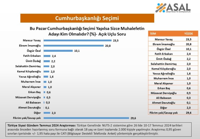 Kamoyunda ve siyasette "erken seçim" tartışmaları günbegün ısınırken muhalefetin cumhurbaşkanı adayının kim olması gerektiği de başlıca merak konularından biri haline geldi.ASAL Araştırma ve Danışmanlık Şirketi, yaptığı yeni anket çalışmasıyla sorunun yanıtını aradı. Şirket, 10-17 Temmuz 2024 tarihleri arasında İstanbul, Tekirdağ, Balıkesir, İzmir, Aydın, Manisa, Bursa, Kocaeli, Ankara, Konya, Antalya, Adana, Hatay, Kırıkkale, Kayseri, Zonguldak, Kastamonu, Samsun, Trabzon, Erzurum, Ağrı, Malatya, Van, Gaziantep, Şanlıurfa ve Mardin dahil 26 ilde 2 bin kişiyle bilgisayar destekli telefon yöntemiyle (CATI) yaptığı anket çalışmasında yurttaşlara, "Bu Pazar Cumhurbaşkanlığı Seçimi Yapılsa Sizce Muhalefetin Adayı Kim Olmalıdır?" açık uçlu sorusunu yöneltti.