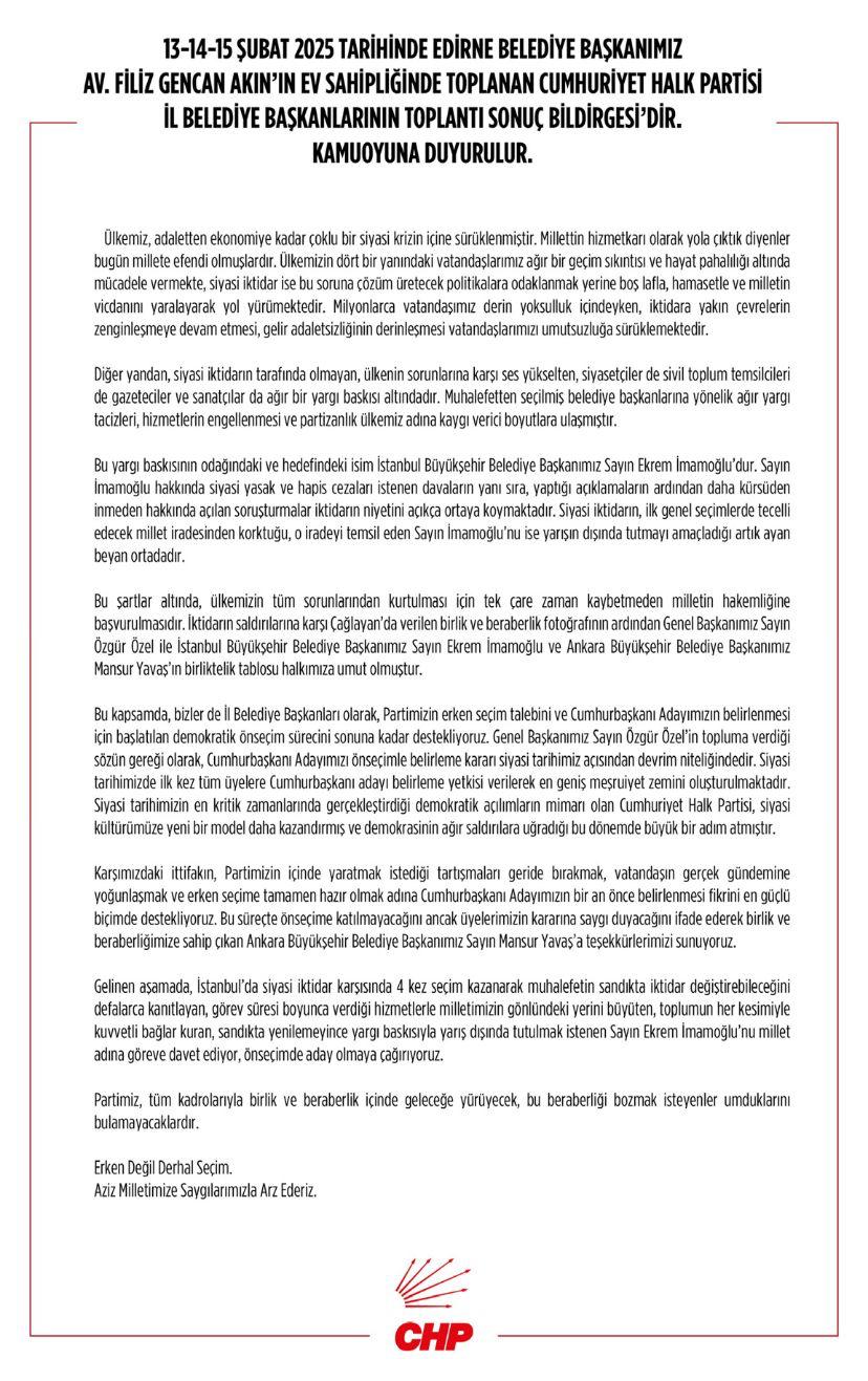 CHP’li il belediye başkanları toplantısı sonuç bildirgesi açıklandı. Bildirgede, "Partimizin erken seçim talebini ve cumhurbaşkanı adayımızın belirlenmesi için başlatılan demokratik önseçim sürecini sonuna kadar destekliyoruz. Bu süreçte önseçime katılmayacağını ancak üyelerimizin kararına saygı duyacağını ifade ederek birlik ve beraberliğimize sahip çıkan Ankara Büyükşehir Belediye Başkanımız Sayın Mansur Yavaş’a teşekkürlerimizi sunuyoruz. İstanbul’da siyasi iktidar karşısında dört kez seçim kazanarak muhalefetin sandıkta iktidar değiştirebileceğini defalarca kanıtlayan, sandıkta yenilemeyince yargı baskısıyla yarış dışında tutulmak istenen Sayın Ekrem İmamoğlu’nu millet adına göreve davet ediyor, ön seçimde aday olmaya çağırıyoruz" denildi.