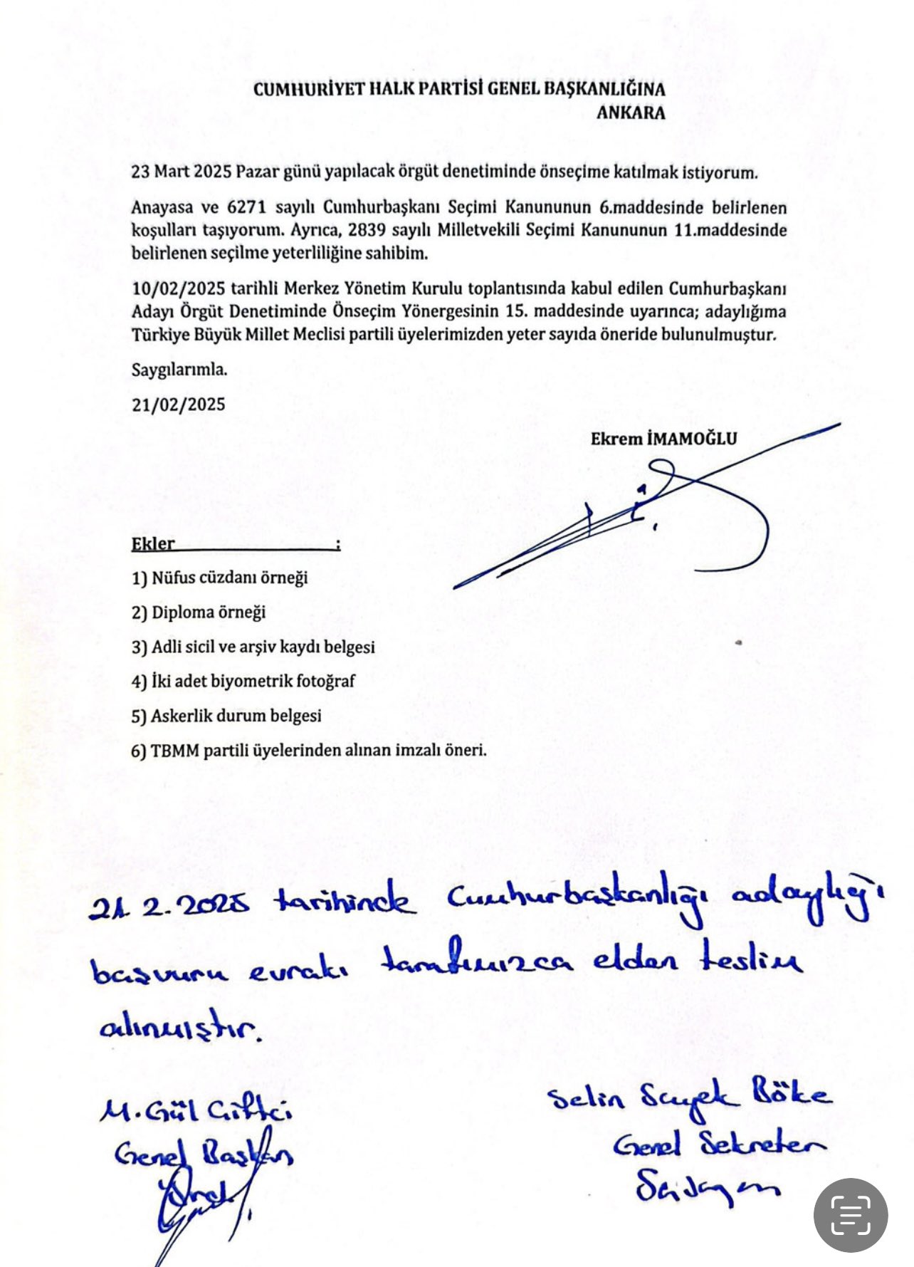 "Parlamenter demokrasi, güçler ayrılığı ve denge denetleme mekanizmalarını en kısa zamanda hayata geçireceğiz"İmamoğlu, şunları kaydetti:"Bugün yeni bir başlangıcın ilk adımını atarak, mensubu olmaktan onur duyduğum Cumhuriyet Halk Partisi’nin Cumhurbaşkanı Adayı olmak için resmi müracaatımı yaptım. İnsanca yaşamayı hak eden, özgürlüğe, adalete, refaha ve birlik olmaya hasret milletimizle bir yolculuğa çıkıyoruz. Devletimizi demokratik ve güçlü, milletimizi zengin ve huzurlu, vatandaşlarımızı eşit ve özgür kılma yolculuğuna çıkıyoruz. Parlamenter demokrasi, güçler ayrılığı ve denge denetleme mekanizmalarını en kısa zamanda hayata geçireceğiz. Demokratik katılımı önceleyeceğiz. Milletimizin kaygılarını, endişelerini giderecek, hep birlikte umudu ve gelecek hayallerini ayağa kaldıracağız. Adaleti iktidarın değil mülkün temeli kılacak, devletin kurumlarını, bilimi, sanatı, sporu, medyayı partizanlıktan kurtaracak, rakiplerimizi düşman görmeyecek, siyasi rekabeti milletin huzurunda adil, medeni ve mertçe bir yarışa dönüştüreceğiz. Ülkemize, birliğimize, dirliğimize ve güçlü Türkiye hedefine hep birlikte sahip çıkacağız. Çok çalışacağız, çok kazanacağız, adil paylaşacağız. Milletçe bereketimizi artıracağız. İnanç ve umutla yürüyeceğimiz bu mücadelede asla yorulmayacağız ve asla vazgeçmeyeceğiz. Gazi Mustafa Kemal Atatürk’ün ve şehitlerimizin emaneti Cumhuriyetimiz’i ikinci yüzyılında bir yıldız misali parlatacağız. Milletimizin güçlü katılımı ve dualarıyla, Yolumuz açık olsun."Bugün yeni bir başlangıcın ilk adımını atarak, mensubu olmaktan onur duyduğum Cumhuriyet Halk Partisi’nin Cumhurbaşkanı Adayı olmak için resmi müracaatımı yaptım.