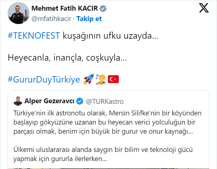Sanayi ve Teknoloji Bakanı Mehmet Fatih Kacır da Alper Gezeravcı’nın paylaşımını alıntılayarak yorumda bulundu. Bakan Kacır, “TEKNOFEST kuşağının ufku uzayda… Heyecanla, inançla, coşkuyla… Gurur duy Türkiye” ifadelerini kullandı.